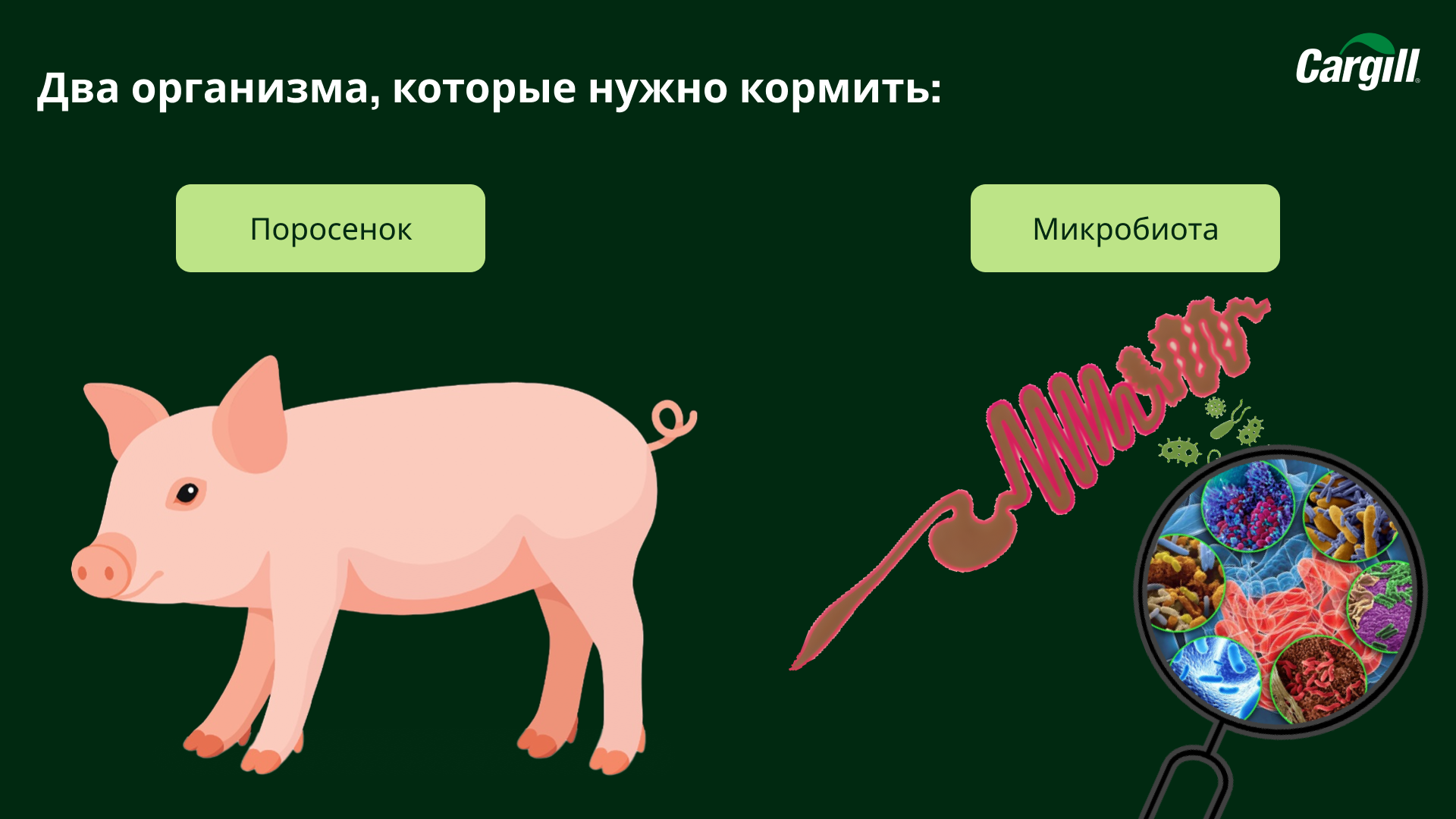 Когда мы кормим поросенка, мы кормим и его микробиоту — триллионы бактерий, населяющих желудочно-кишечный тракт. И если потребности поросенка в питательных веществах изучены давно, то потребности микробиоты долгое время оставались на втором плане. Оказалось,они оба нуждаются в питательных веществах, но их потребности не совпадают! (Источник: Hackenhaar, 2023).