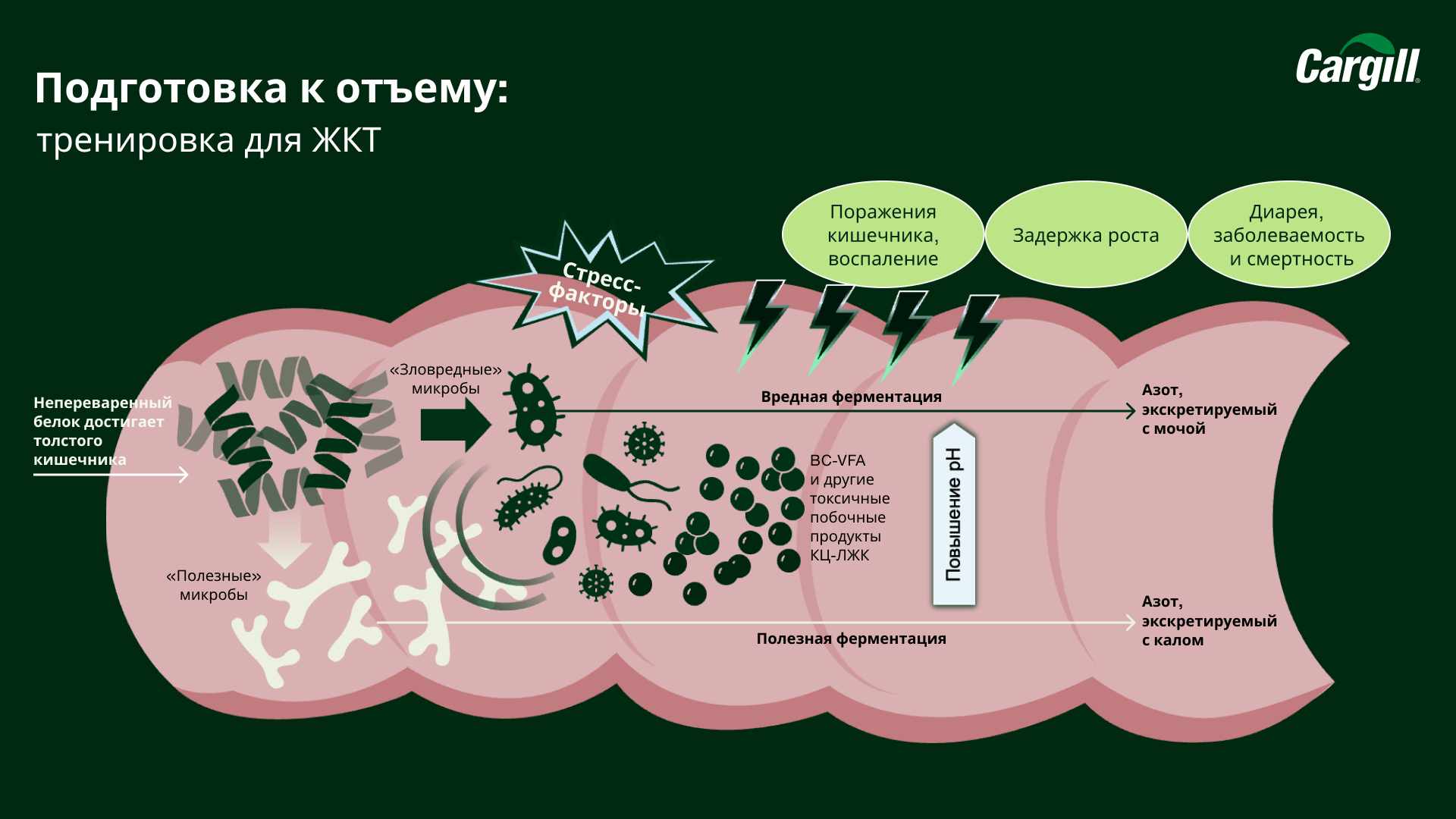 Главная задача специалиста по кормлению — сократить количество непереваренного белка, который вредные бактерии используют в качестве основного источника энергии (ферментация) тем самым «переключив» микробиоту с поедания белка на потребление углеводов (клетчатки).Клетчатка служит питанием для полезных бактерий, которые превращают углеводы в летучие жирные кислоты, а азот в белок.