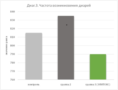 Исследование показало, что в группе 2, где поросята потребляли контаминированный микотоксинами корм, были наивысшие баллы, то есть диареи встречались чаще, чем в других группах (диаг.3). В группе 3, где поросята также потребляли контаминированный корм, но вместе с элиминатором микотоксинов ЭЛИТОКС®, частота диарей была снижена до уровня контрольной группы.
