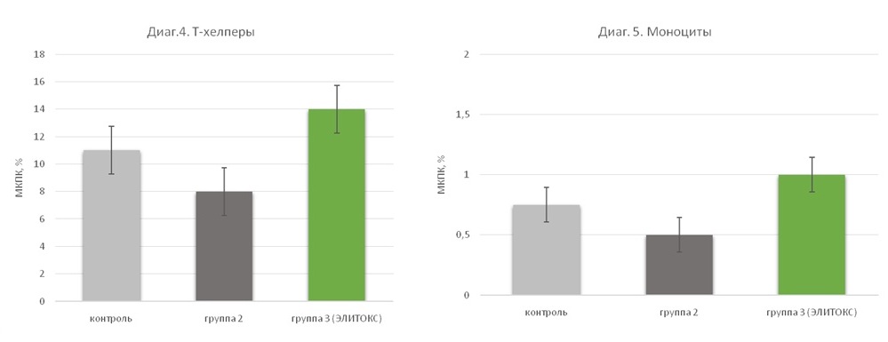 Для оценки влияния микотоксинов на иммунную систему проанализировали количество лимфоцитов, циркулирующих в периферической крови методом проточной цитометрии на 21 сутки опыта. Количество Т-хелперов и моноцитов определяли в процентах от общего количества циркулирующих мононуклеарных клеток периферической крови (МКПК).