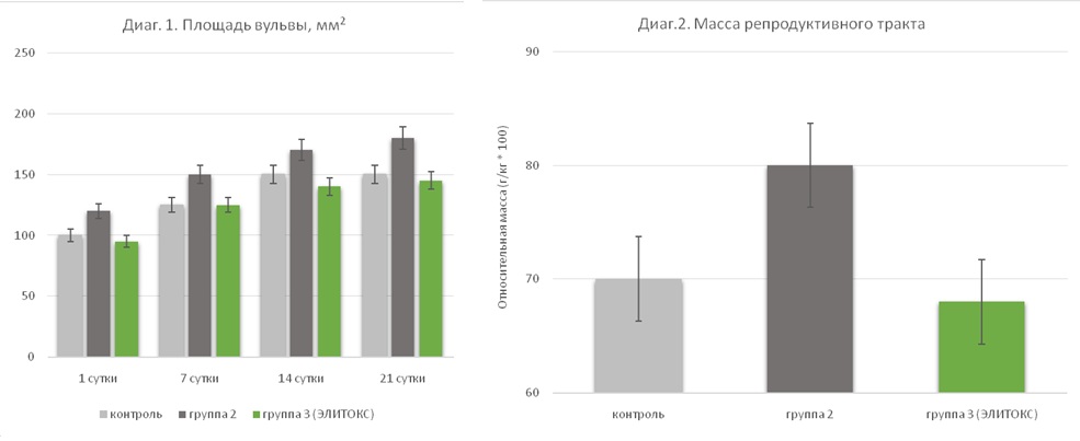 Наличие в корме зеараленона привело к патологическим изменениям у поросят из группы 2 со стороны репродуктивного тракта – отечность вульвы (диаг.1), увеличение относительной массы органов репродуктивного тракта (диаг.2). У поросят из группы 3 (контаминированный корм + элиминатормикотоксинов) все анализируемые параметры были на уровне контрольной группы, что говорит об успешной нейтрализации неполярных микотоксинов и элиминации полярных и неполярных микотоксинов из организма до развития патологических изменений в организме.