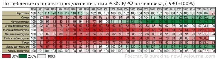Подытоживая. О какой эффективности капитализма можно говорить, если потребление базовых и традиционных продуктов питания в России так и не достигло уровня позднего СССР спустя почти 30 лет?"