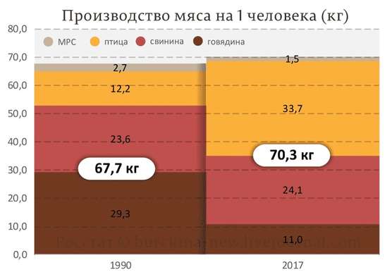 Мясо и мясопродукты - 1990 год - 75 кг, 2000 год - 45 кг, 2017 г - 75 кг