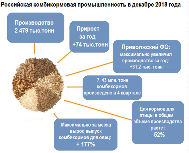 По итогам декабря минувшего года животноводы оказались обеспечены кормами, хотя к концу года запасы и зерна, и кормов немного снизились в годовом исчислении. Урожай зерна хоть и уступил показателям 2017 года, все же был высоким, хотя активный экспорт сократил запасы зерновых почти на 24%. Это несколько отразилось на наличии кормов: показатель за год упал на 4,3%. При этом производство, на фоне высокого урожая, все показало позитивную динамику: суммарный объем производства комбикормов в декабре 2018 года составил 2,5 млн. тонн, поэтому к в начале 2019 года можно ожидать роста показателей по кормовым запасам. Не смотря на низкие производственные показатели в конце осени из-за плохой погоды, повлиявшей на уборку урожая, высокие показатели начала нового сельхозгода способствовали тому, что общий показатель производства комбикормов по итогу декабря вырос на 65 тыс. тонн и достиг максимума за 2018 год.