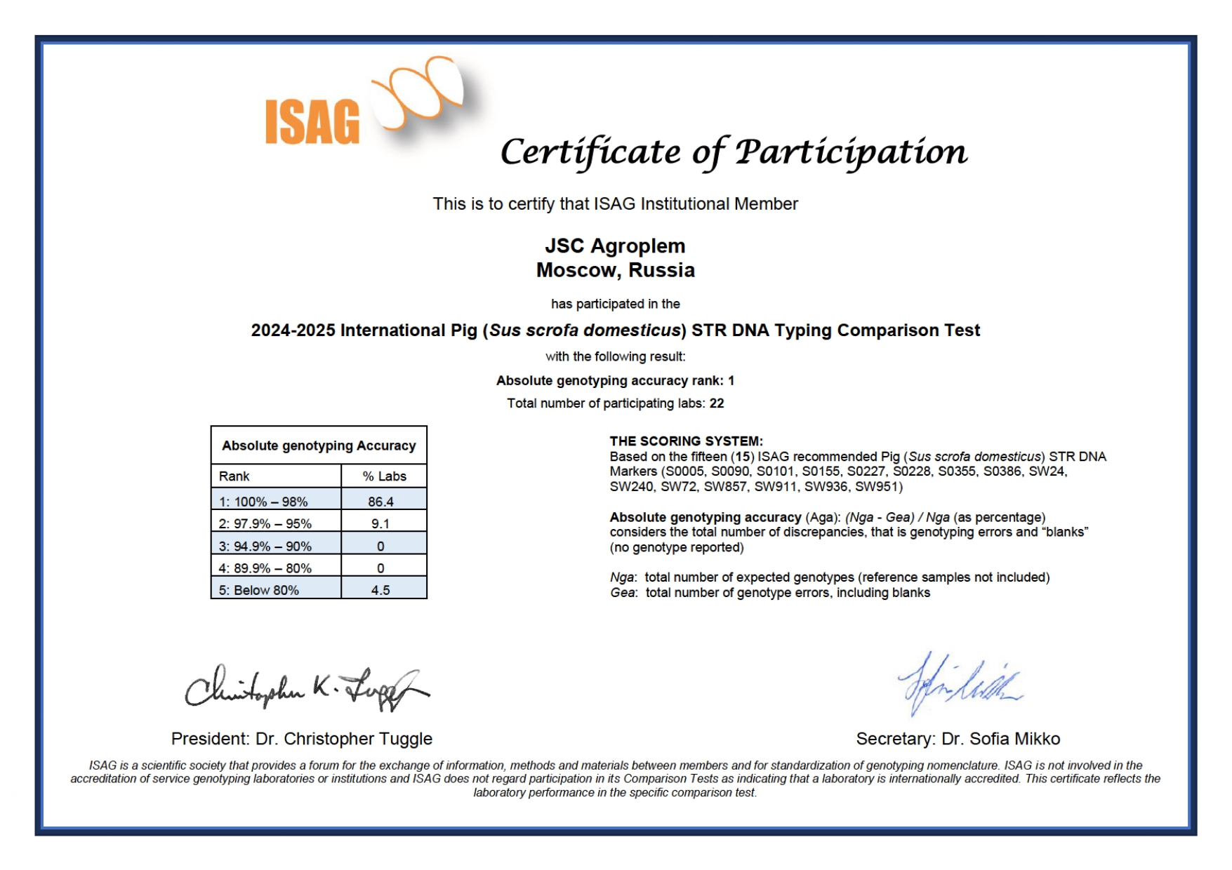 Подтверждено на международном уровне: единственная в России лаборатория молекулярно-генетической экспертизы «Агроплем» вошла в список лучших лабораторий мира по итогам раунд-теста ISAG по подтверждению происхождения свиней.