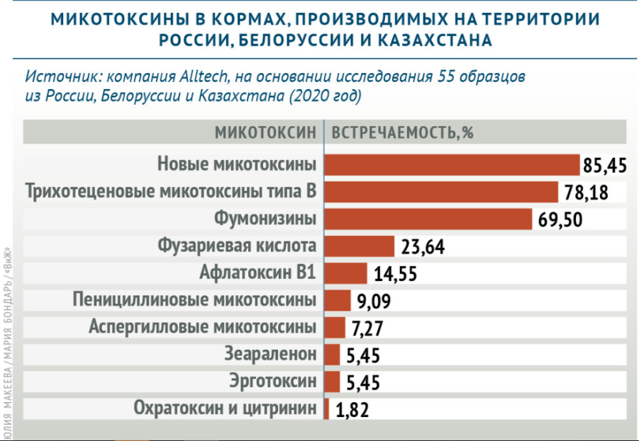 Слова эксперта подтверждаются данными компании Alltech. Результаты мониторинга образцов, полученных из России, Белоруссии и Казахстана, говорят о факте их множественной контаминации. То есть 96,4% исследуемых образцов были загрязнены двумя и более микотоксинами.
