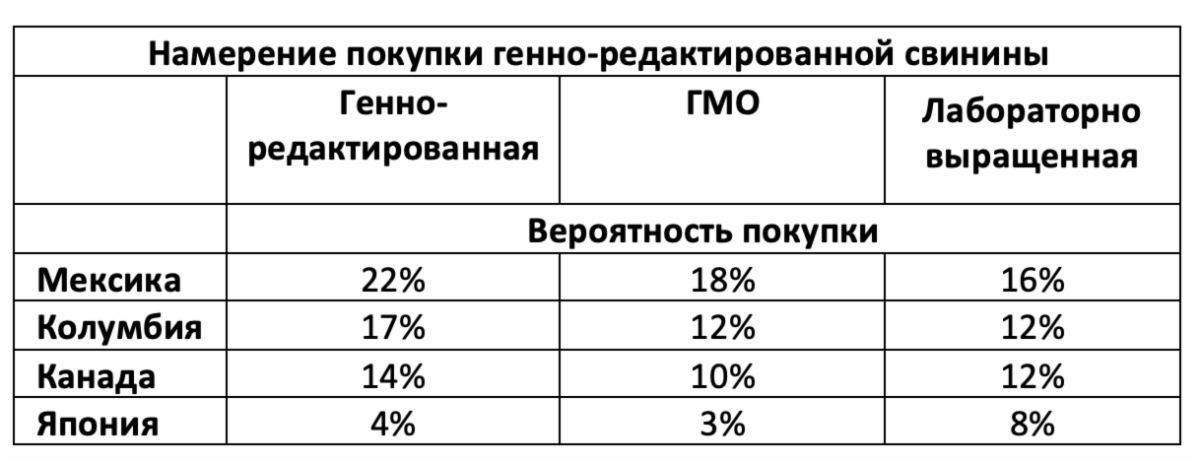 Опрос показывает, что чёткая маркировка крайне важна (например, «Генно-редактированная свинина»): Япония — 72%, Канада — 69%, Колумбия — 61%, Мексика — 57%. Нет сомнений, что попытки переработчиков, ритейлеров или общепита «тихо» внедрить генно-редактированную свинину в продовольственную цепочку могут привести к серьёзному ущербу для брендов тех, кто проигнорирует доминирующее мнение потребителей.