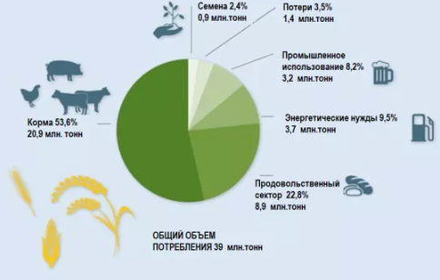 Почти 23% потребления зерна в Германии было использовано для производства продуктов питания (+3%), а около 18% (-1%) пошло на энергетические и промышленные нужды. Семена и потери составили почти 6%.