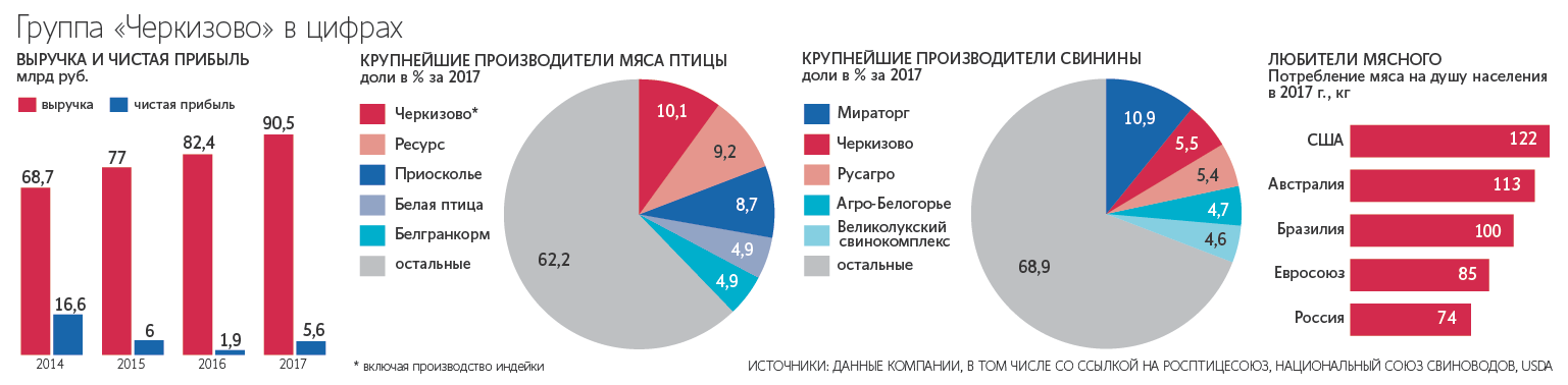 Один из крупнейших российских агрохолдингов – группа «Черкизово» практически завершила основные инвестиционные проекты в сельском хозяйстве: компания – лидер по производству мяса птицы и номер два по свинине. Что дальше? Последние годы Россия полностью обеспечивает себя этими видами мяса, а доступ к экспорту ограничен из-за постоянных вспышек болезней животных. «Черкизово», впрочем, считает домашний рынок стратегически важным независимо от экспортных возможностей. Но теперь основной упор сделает на продукцию в потребительской упаковке, глобальная цель – стать первыми в продаже таких товаров, говорит гендиректор и сын основателя «Черкизово» Сергей Михайлов. Амбициозную задачу предстоит решать в непростых условиях, когда спрос на колбасы и деликатесы падает: потребители все больше стремятся к здоровому питанию плюс растет ресторанный рынок с сервисами по доставке еды. Но выбор сделан: Михайлов уверяет, что «Черкизово» отказалось от органического роста агроподразделения.