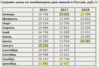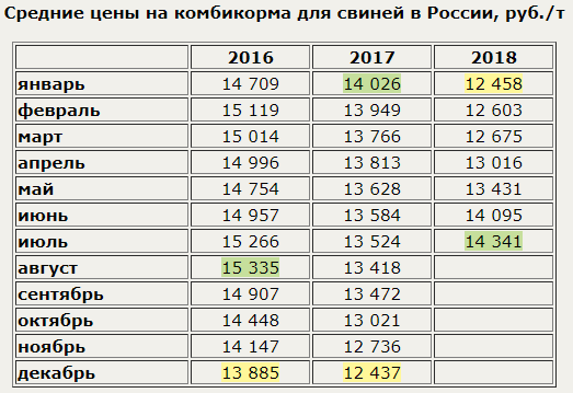 За период с января 2016 г. минимальная цена на комбикорма для свиней в России была зарегистрирована в декабре 2017 г. - 12,4 тыс. руб./т, пишет SoyaNews; абсолютным же рекордом для данного продукта стала цена, зафиксированная в августе 2016 года - 15,3 тыс. руб./т.