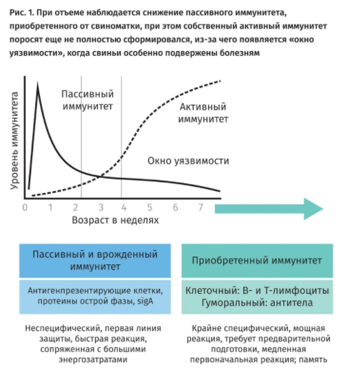 При этом современные методы свиноводства предполагают отъем поросят от свиноматки еще до того, как у них полностью сформируется собственный приобретенный иммунитет (Рис. 1).