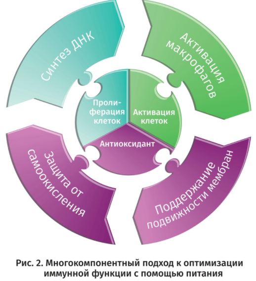 Многокомпонентный подход предполагает главным образом поддержку пролиферации иммунных клеток, их активацию и защиту с помощью оптимизации питания (Рис. 2).