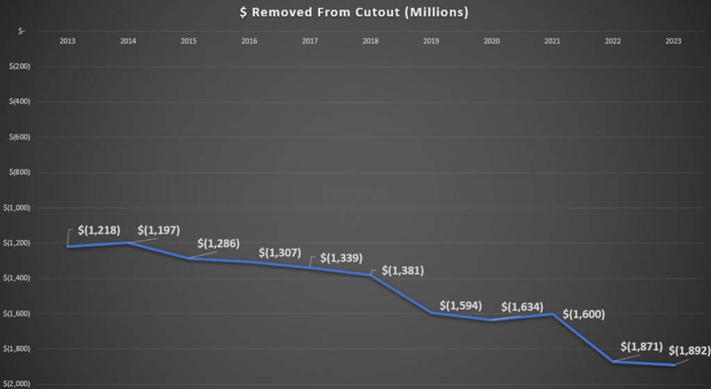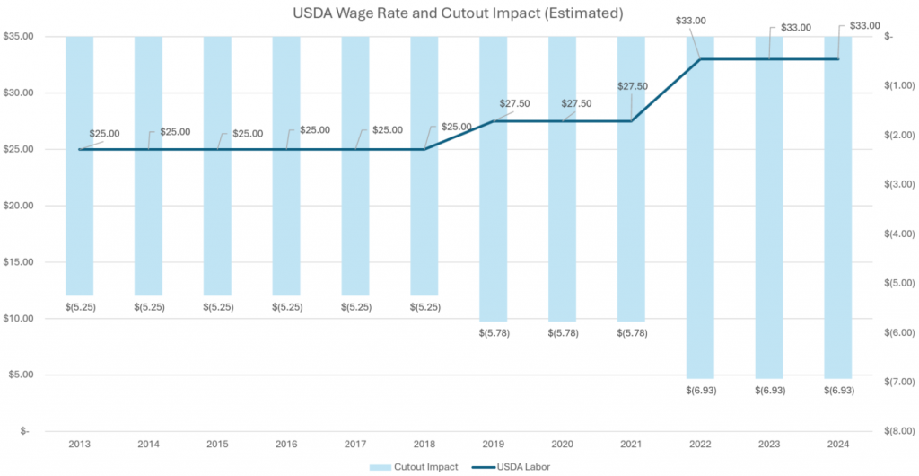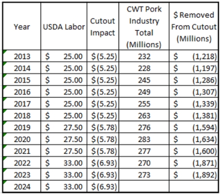 Присланные читателем графики показывают, как ежегодное исключение затрат на рабочую силу при производстве свиных туш в отличие от говядины влияет на нашу отрасль. Миллиарды долларов. С 2013 по 2023 год эта сумма превышает $15 миллиардов долларов. По последним расчётам 6.93¢ цента за фунт, умноженные на тушу весом 200 фунтов (90.72 кг), составят $14 US за голову. Большие деньги для отрасли, испытывающей финансовые трудности.
