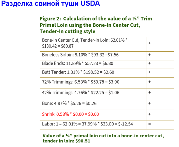 Производитель сообщает, что Министерство сельского хозяйства США (USDA) проводит опрос среди мясо-переработчиков, чтобы определить среднюю ставку заработной платы. В справочнике USDA по разделке свинины на странице 3 (прилагается) указано, что они исключают трудозатраты как компонент при расчёте разделки туш на сортовые отруба.В случае с разделкой говяжьих туш трудозатраты при расчёте не исключаются. Исключение трудозатрат при разделке свинины снижает её стоимость.