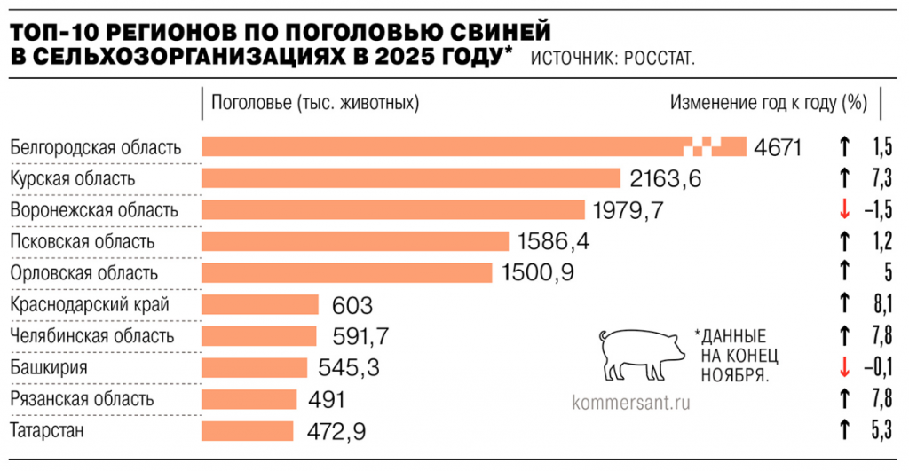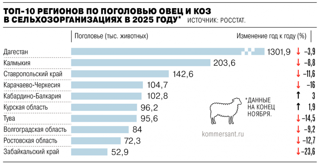 В январе—ноябре 2025 года производство овец и коз на убой снизилось на 6,3%. Снижение объясняется структурными проблемами в отрасли: более 90% мелкого рогатого скота содержится в личных подсобных хозяйствах, которые испытывают трудности из-за роста издержек и сокращения каналов сбыта. В то же время наблюдается рост производства на убой птицы и свинины, что во многом связано с переходом потребителей на более дешевое мясо.