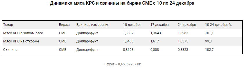 Всего с 26 ноября по 10 декабря котировки мяса КРС в живом весе опустились с 1,412 до 1,3807 доллара за фунт или на 2,2%. Котировки мяса КРС на откорме снизились с 1,6715 до 1,6488 доллара за фунт или на 1,4%. Котировки свинины не изменились, а в ноябре выросли с 0,7655 до 0,8103 доллара за фунт или на 6,5%.