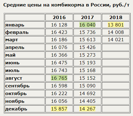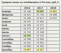 Средняя цена на комбикорма в нашей стране в марте 2018 г. установилась на уровне 14,0 тыс. руб./т - это всего на 0,1% больше, чем в предыдущем месяце, хотя и на 10,2% меньше, чем в марте 2017 года. С начала года цена выросла на 1,6.