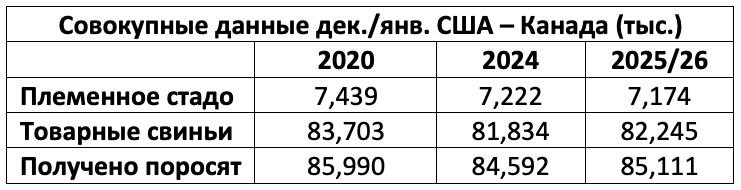 Мы находимся на континентальном рынке. Канада поставляет поросят и свиней в США. США поставляют свинину в Канаду. В канадских магазинах вы видите Johnsonville, Hillshire, Tyson, Hormel, Smithfield, JBS и т.д. Общее поголовье свиней в обеих странах. Канада недавно опубликовала данные по запасам на 1 января. Объединив данные США на 1 декабря и Канады на 1 января, можно понять, что нас ждёт.