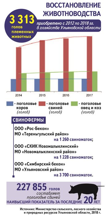 - Пока что свинокомплексы работают еще не в полную силу. Если в течение 2019 года они выйдут на проектную мощность, то, конечно, прирост поголовья будет заметный, - комментирует референт департамента животноводства, племенного дела и аквакультуры министерства АПК и развития сельских территорий Ульяновской области Алексей Шаронин.