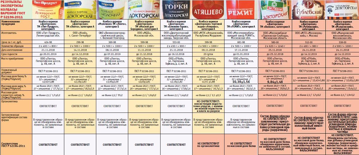 Петербургская организация потребителей «Общественный контроль» отправила в лабораторию «Тест-С.-Петербург» 10 образцов ГОСТовских вареных колбас разных производителей. Результаты экспертизы показали — половина из них не соответствует стандарту, а три эксперты и вовсе назвали фальсификатом. По словам общественников, популярный в России продукт постоянно находится в десятке наиболее фальсифицируемых пищевых продуктов, что подверждают ежегодные исследования «Общественного контроля».