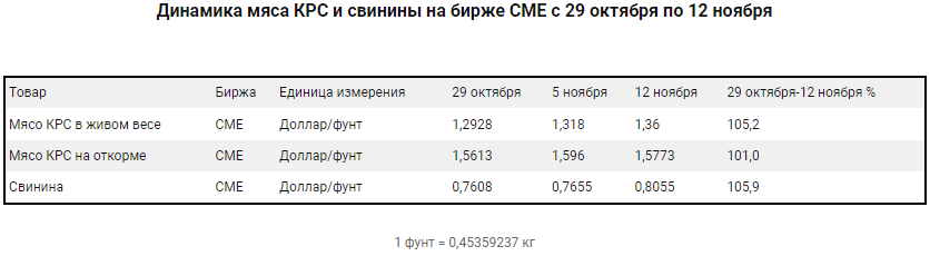 Всего с 29 октября по 12 ноября котировки мяса КРС в живом весе повысились с 1,2928 до 1,36 доллара за фунт или на 5,2%. Котировки мяса КРС на откорме поднялись с 1,5613 до 1,5773 доллара за фунт или на 1%. Котировки свинины выросли с 0,7608 до 0,8055 доллара за фунт или на 5,9%, — передает «КазахЗерно.kz».