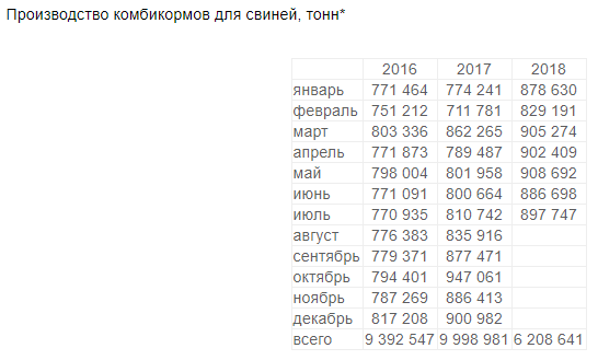 В июле 2018 г. в стране произведено 897,7 тыс.тонн комбикормов для свиней - это на 1,2% больше, чем месяцем ранее, и на 10,7% больше, чем в июле 2017г. За 7 месяцев 2018 года в России произвели на 11,8% больше комбикормов для свиней, чем в аналогичном периоде 2017 года.