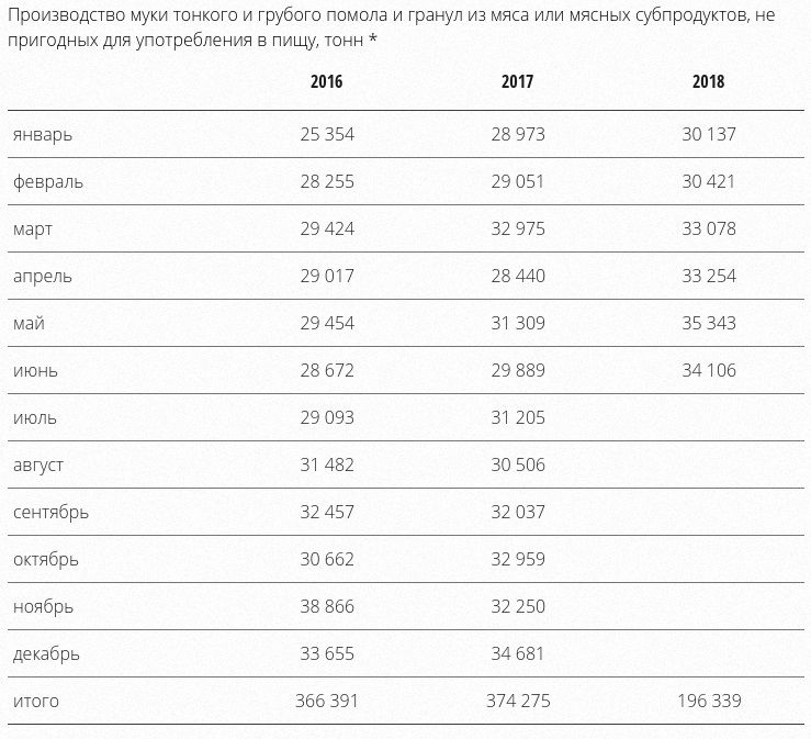 За 6 месяцев 2018 года по сравнению с аналогичным периодом 2017 года производство мясокостной муки выросло на 8,7%.